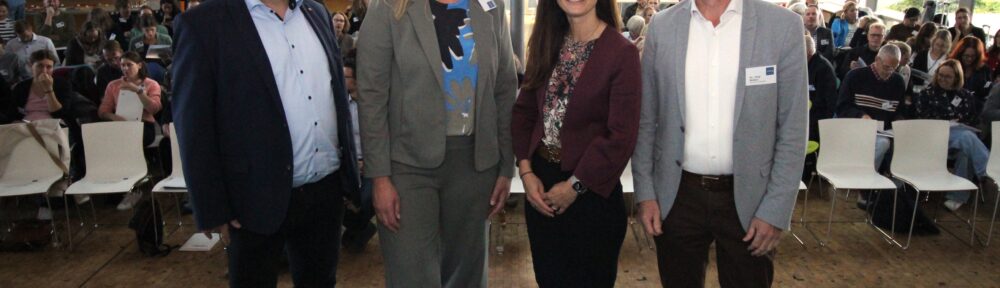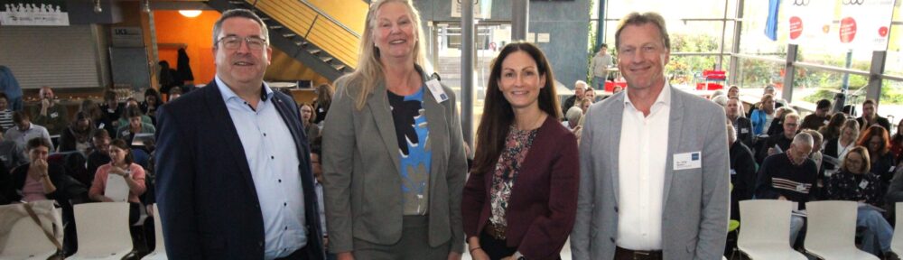 BUZ: (v.l.) Landrat Dr. Axel Lehmann, ADBG-Vorsitzende Stefanie Lehfeld, Karen Zereike, Leiterin des Eigenbetriebs Schulen des Kreises Lippe, und Dr. Jörg Weber, Leiter des Dietrich-Bonhoeffer-Berufskollegs des Kreises Lippe, eröffnen die ADBG-Jahrestagung in Detmold.