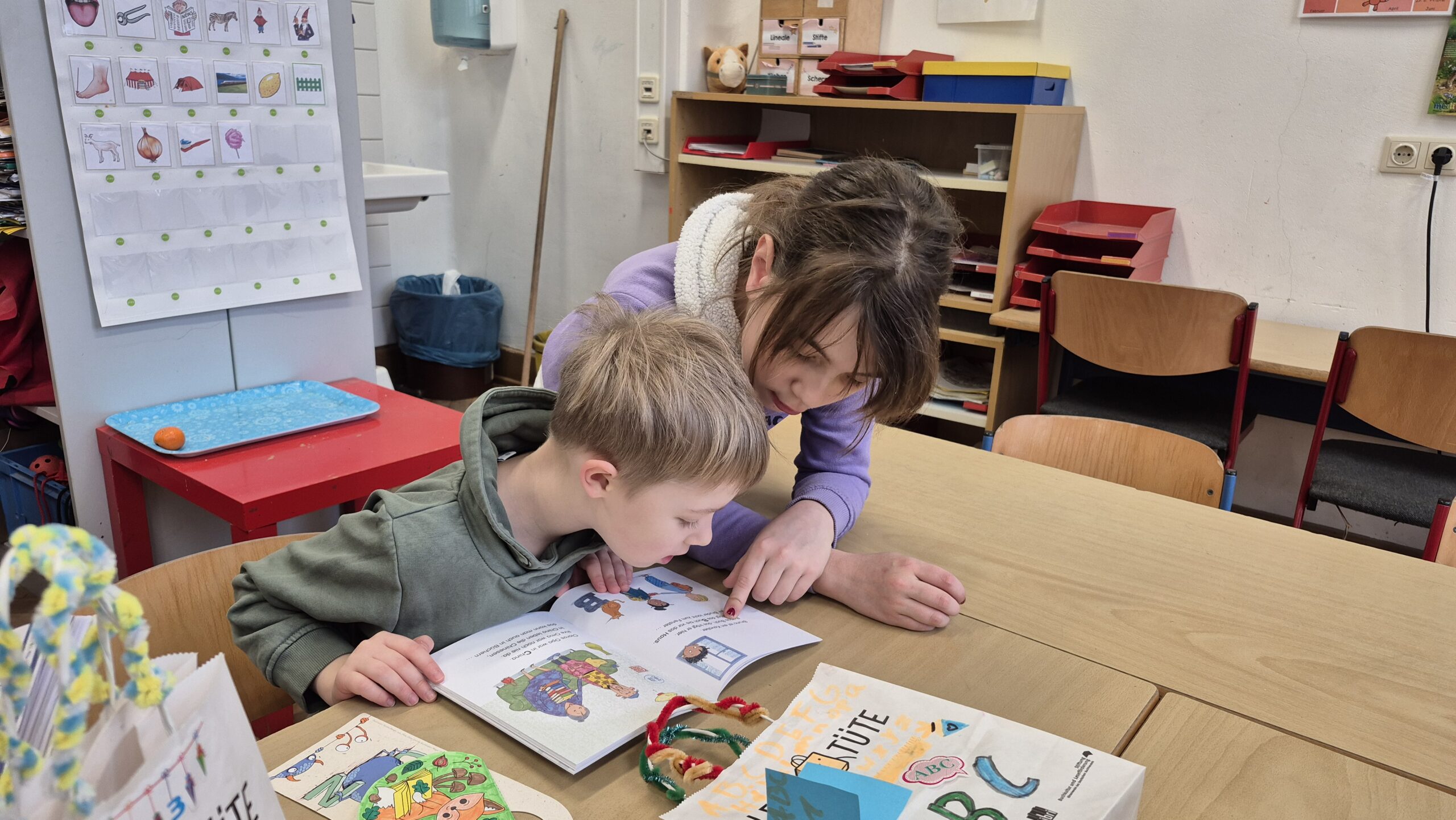 BUZ 2: Zeile für Zeile: Hope (rechts), Viertklässlerin der Grundschule Ahornstraße, begleitet Oskar beim Lesen seines neuen Erstlesebuches.