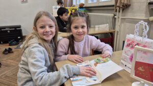 BUZ Beitragsbild: Zeile für Zeile: Amira (rechts), Viertklässlerin der Grundschule Ahornstraße, begleitet Aaliyah beim Lesen ihres neuen Erstlesebuches.