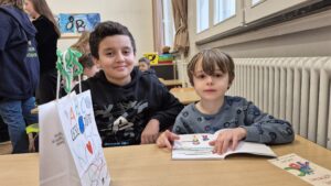 BUZ 4: Zeile für Zeile: Mohammad (links), Viertklässler der Grundschule Ahornstraße, begleitet Ejon beim Lesen seines neuen Erstlesebuches.